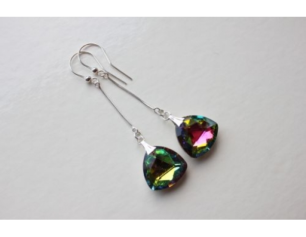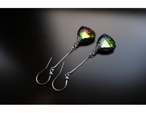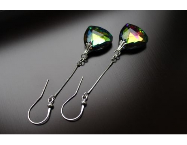 Cudne kolczyki wykonane z jednostronnych kryształków fasetowanych w kształcie zaokrąglonego trójkąta i elementów srebrnych (pr. 925). Kryształki pięknie mienią się w kolorach tęczy (z przewagą zielonego) i rozpraszają światło. Kolczyki czarują blaskiem, wyrazistością i pełnią elegancji. Podkreślą Twoją kobiecość i przykują uwagę otoczenia. Idealne na wieczór.